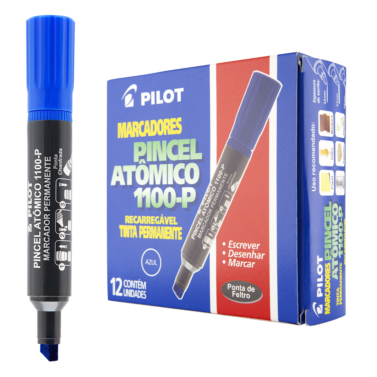 Caixa 12 Pincel Atômico PILOT Marcador Permanente 1100-P Chanfrado AZUL