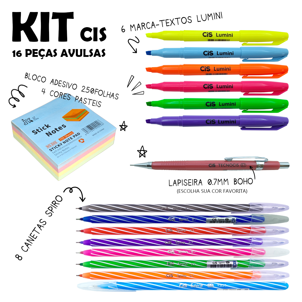KIT de escrita colorida CIS contendo 16 peças, sendo elas,